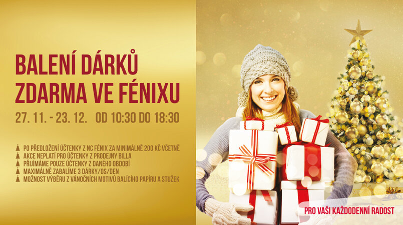 Přijďte do Fénixu nakoupit vánoční dárky a ZDARMA si je nechte zabalit v našem stánku v 1. PP. Každý den do 23. 12. 2018 od 10:30 do 18:30.