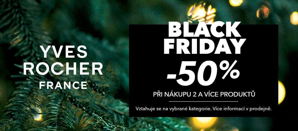 Využijte jedinečnou nabídku na Black Friday v prodejně rostlinné kosmetiky Yves Rocher! Sleva 50 % na 2 a více produktů se vztahuje na vybrané kategorie a platí od 17. 11. do 1. 12. 2025. Více informací v prodejně a na www.yves-rocher.cz.