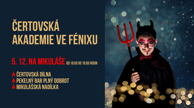 Na Mikuláše ve středu 5. 12. od 16:00 do 19:00 je pro všechny děti připravena Čertovská akademie ve Fénixu. Děti si prověří naše čertí školka - zasoutěží si, začertí si, vyrobí si pekelné výrobky a hlavně se zváží na pekelné váze.