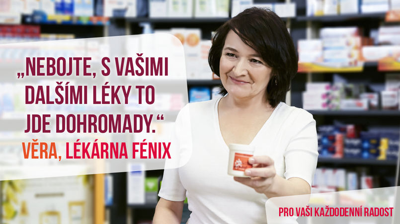 "Nebojte, s vašimi dalšími léky to jde dohromady." - jak říká paní Věra z LÉKÁRNY FÉNIX, který najdete v 1. NP.