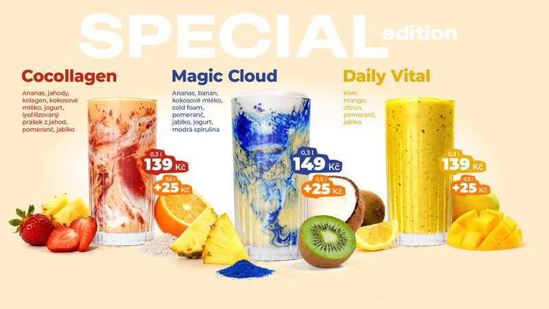 Několik měsíců jsme pracovali na úplně novém směru našich sezónních drinků, které nově představujeme ve formě kvartálních kampaní. Tyto drinky nejsou jen o chuti, ale i o vizuálním zážitku a benefitech pro vaše tělo.