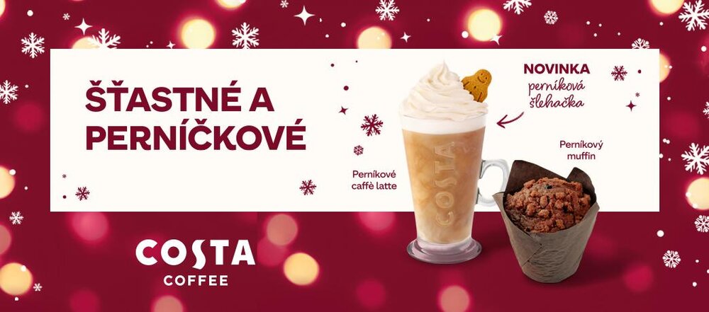 Letos pro vás máme novinku – perníkovou šlehačku v ceně nápoje! Ta dodá Perníkovému caffè latte ještě větší kouzlo. Takto připravený nápoj, lahodně mléčný a chuťově bohatý, vás nejen nakopne, osladí váš den, ale také potěší na pohled. Nesmí v něm totiž chybět pan Perníček, věrný společník každého perníkového „latéčka“, malý symbol Vánoc v Costa Coffee.