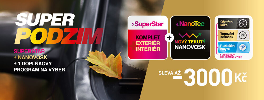 SuperKompletka+ Nanovosk + doplňkový program dle výběru (rozleštění hmyzu nebo ošetření kožených sedaček nebo tepování látkových sedaček). Zvýhodněný balíček 3v1 slevou až -3000 Kč.